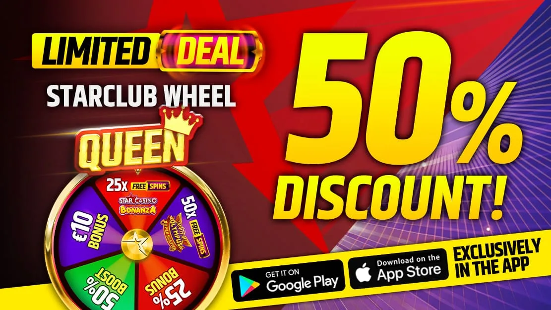 Get 50% mega discount on the Starclub Wheel: Queen! With this Limited Deal, spin the wheel and win amazing bonuses, including free spins, boosts, and much more! 🎰